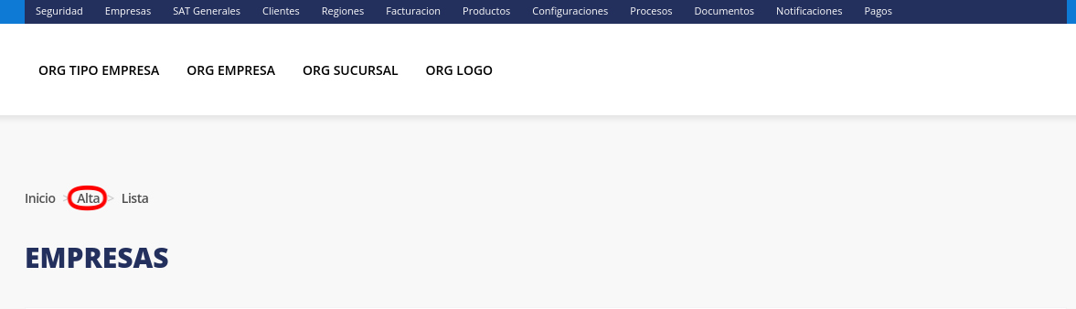 3. Despues deberá entrar a la sección de alta dando click en la opción “Alta” que se encuentra por encima del texto “EMPRESAS”.